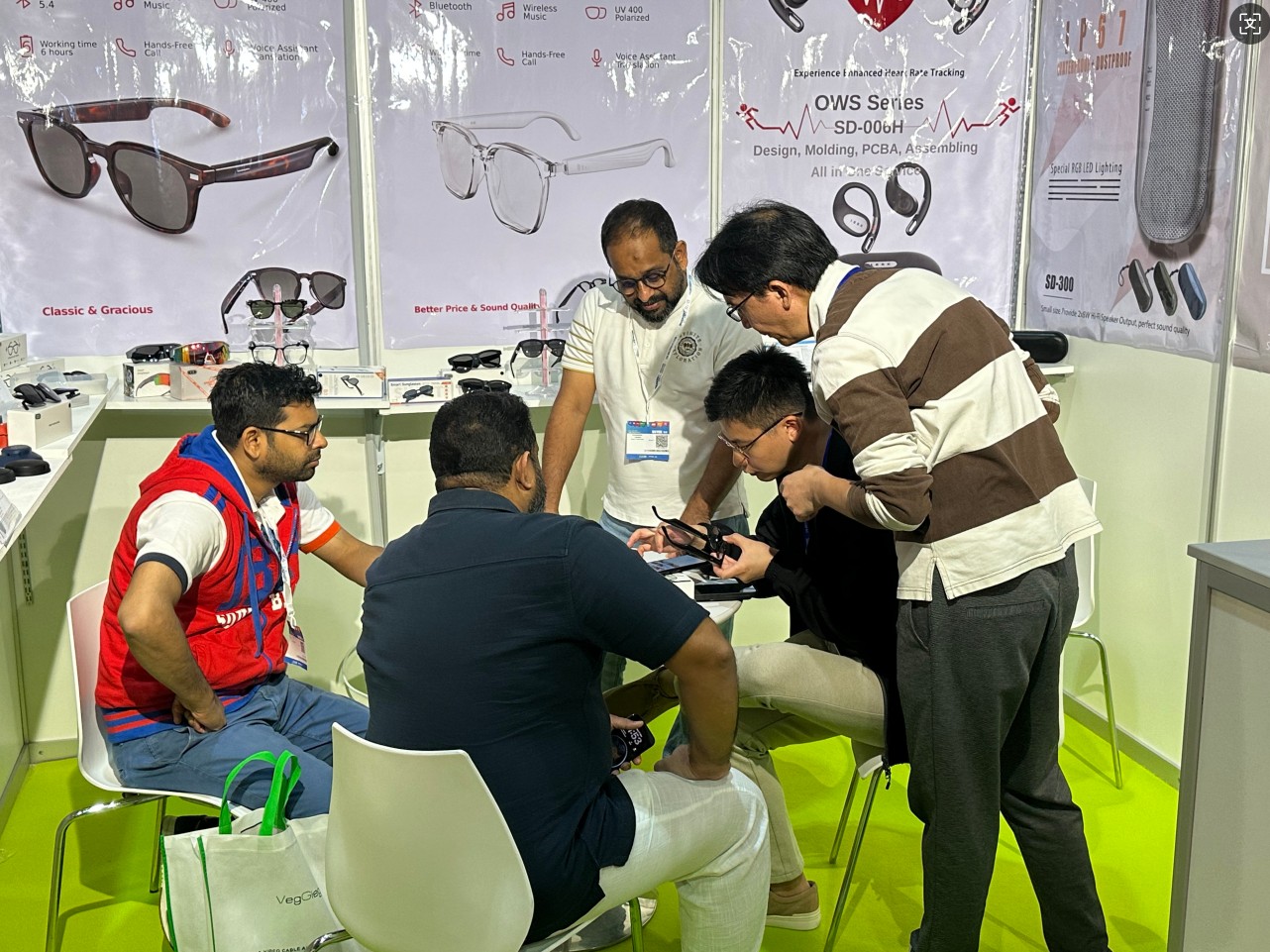 Op de beurs presenteerden we onze nieuwste stijl slimme camerabrillen, audiobrillen, draadloze hoofdtelefoons, oordopjes voor hartslagmeting, en samen met enkele aankomende items voor 2026, zoals gaming-hoofdtelefoons en sportieve brillen.